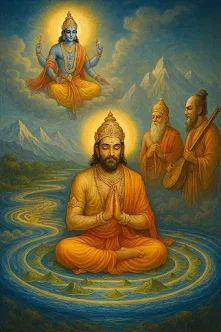 | King Priyavrata in deep reflection, guided by the wisdom of sages and the will of the divine. |